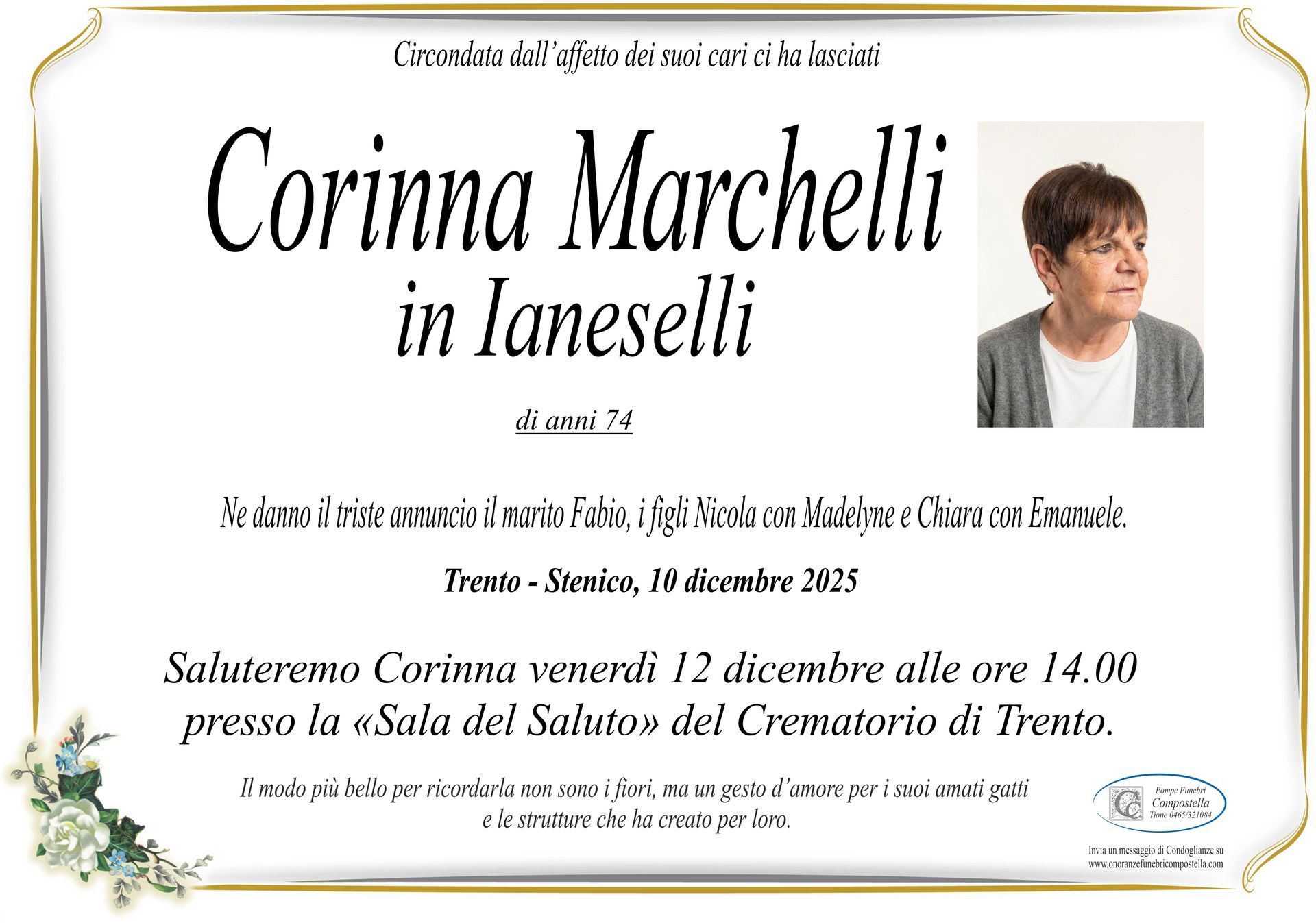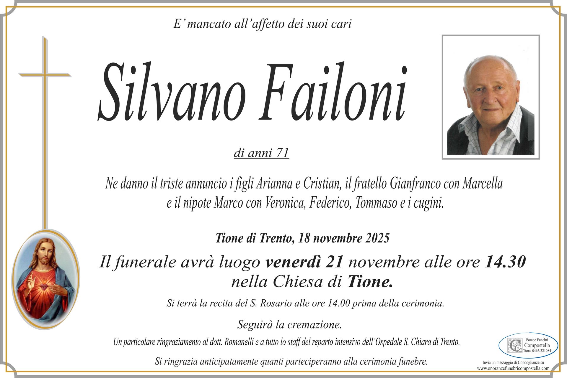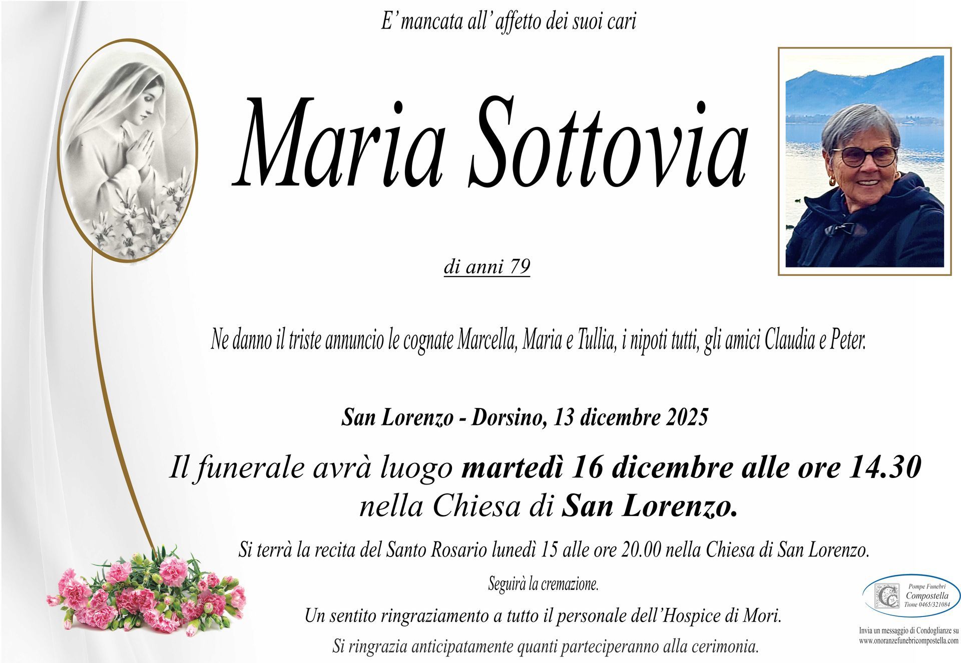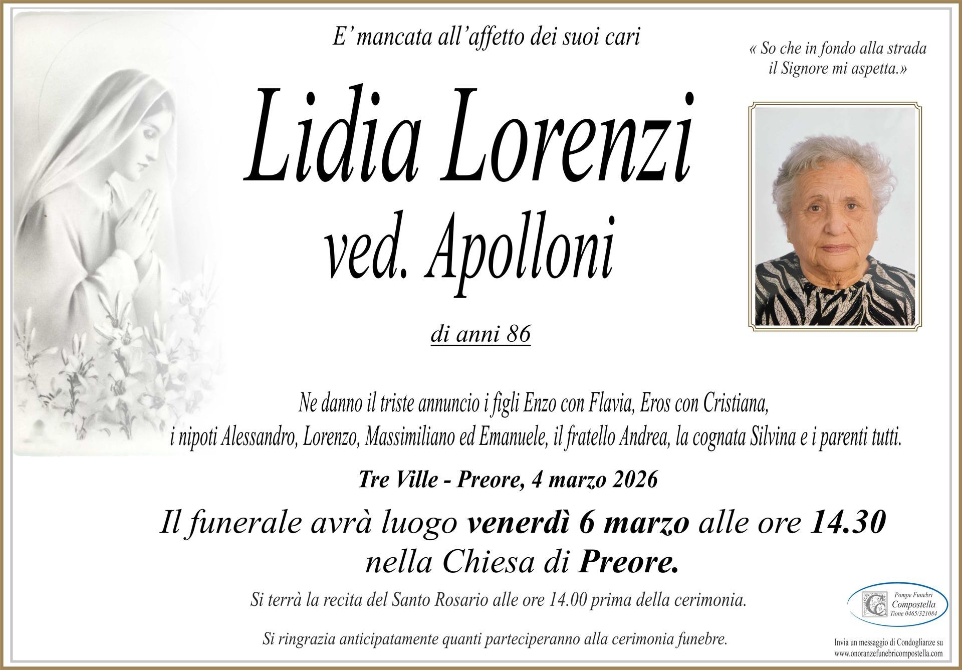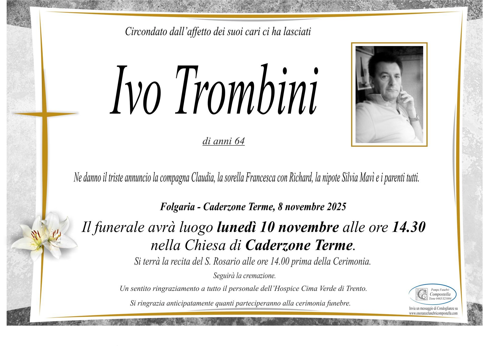 ContattiOnoranze Funebri Compostella a Tione di Trento è disponibile per la pubblicazione di manifesti funebri e condoglianze online.