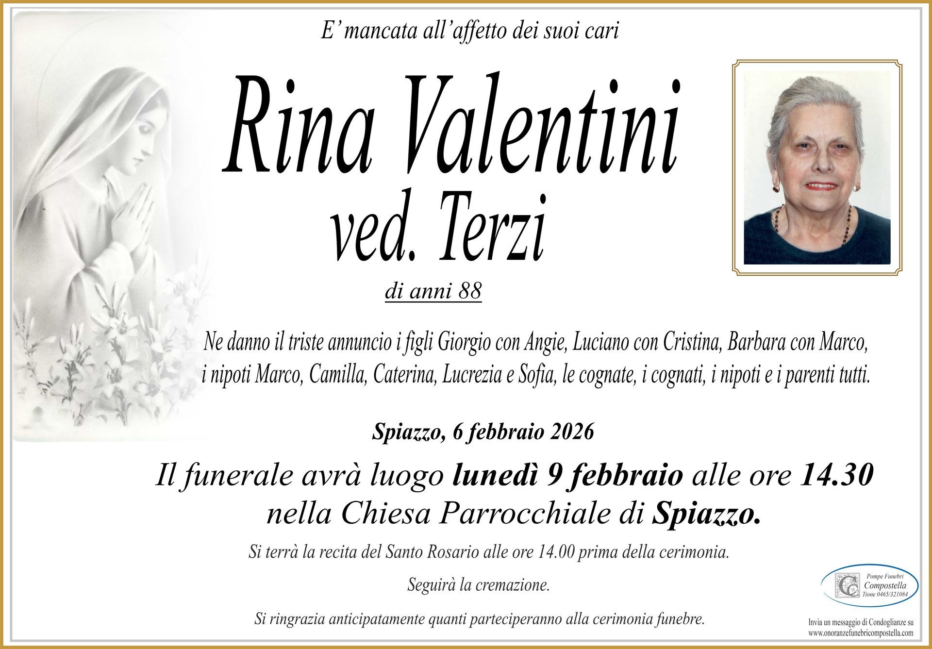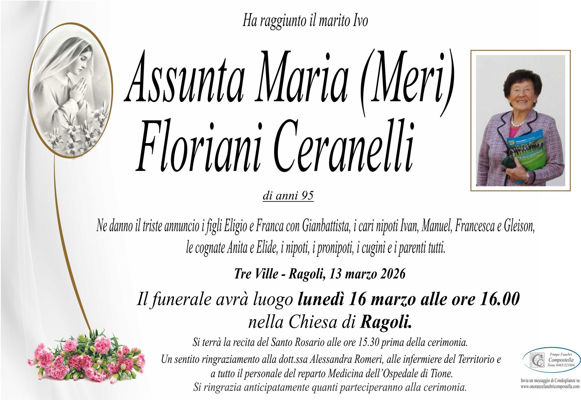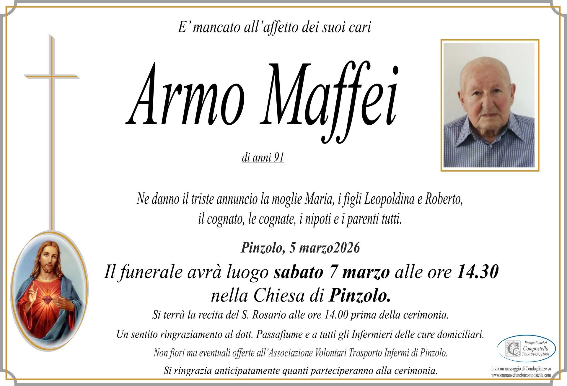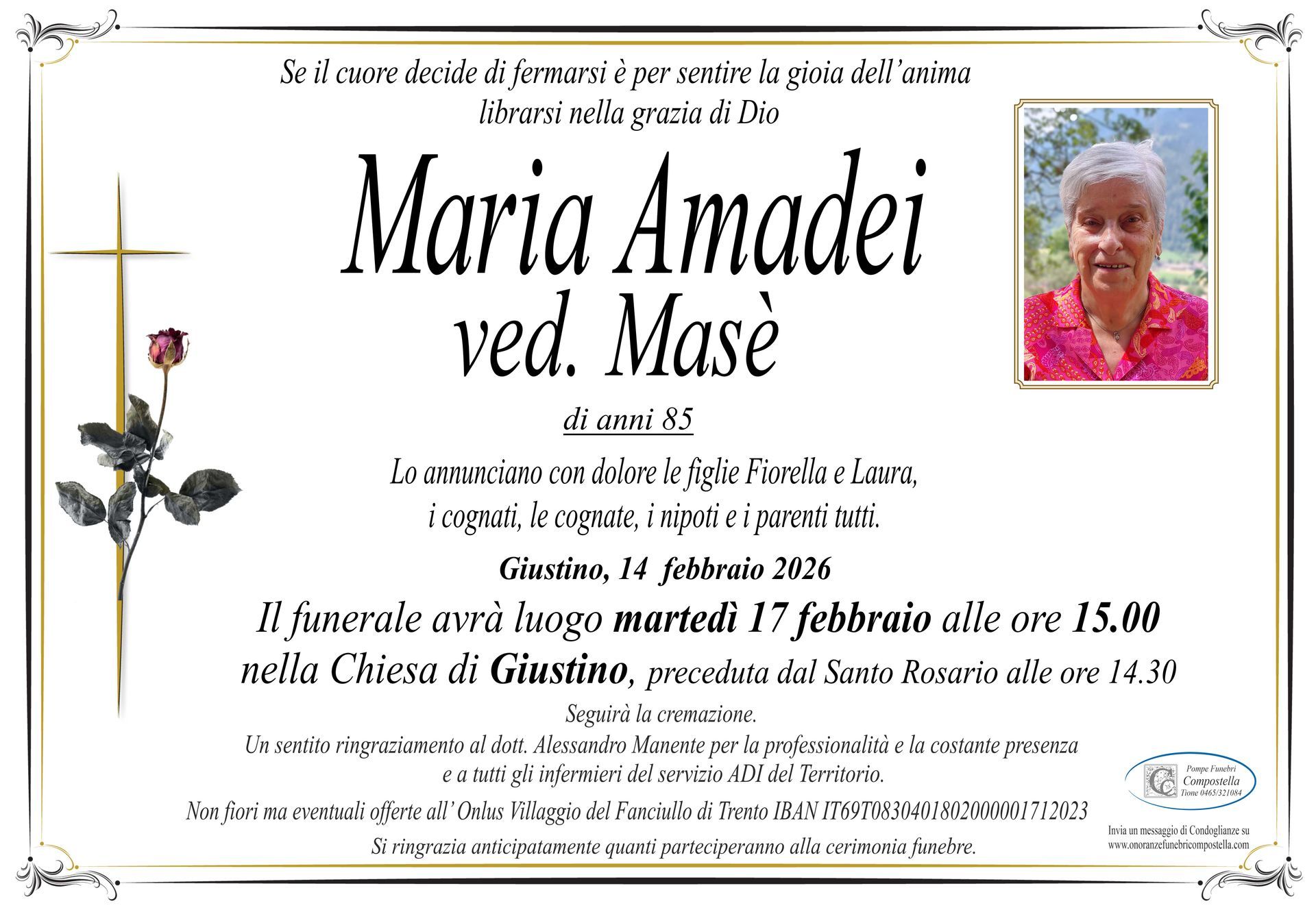 ContattiOnoranze Funebri Compostella a Tione di Trento è disponibile per la pubblicazione di manifesti funebri e condoglianze online.