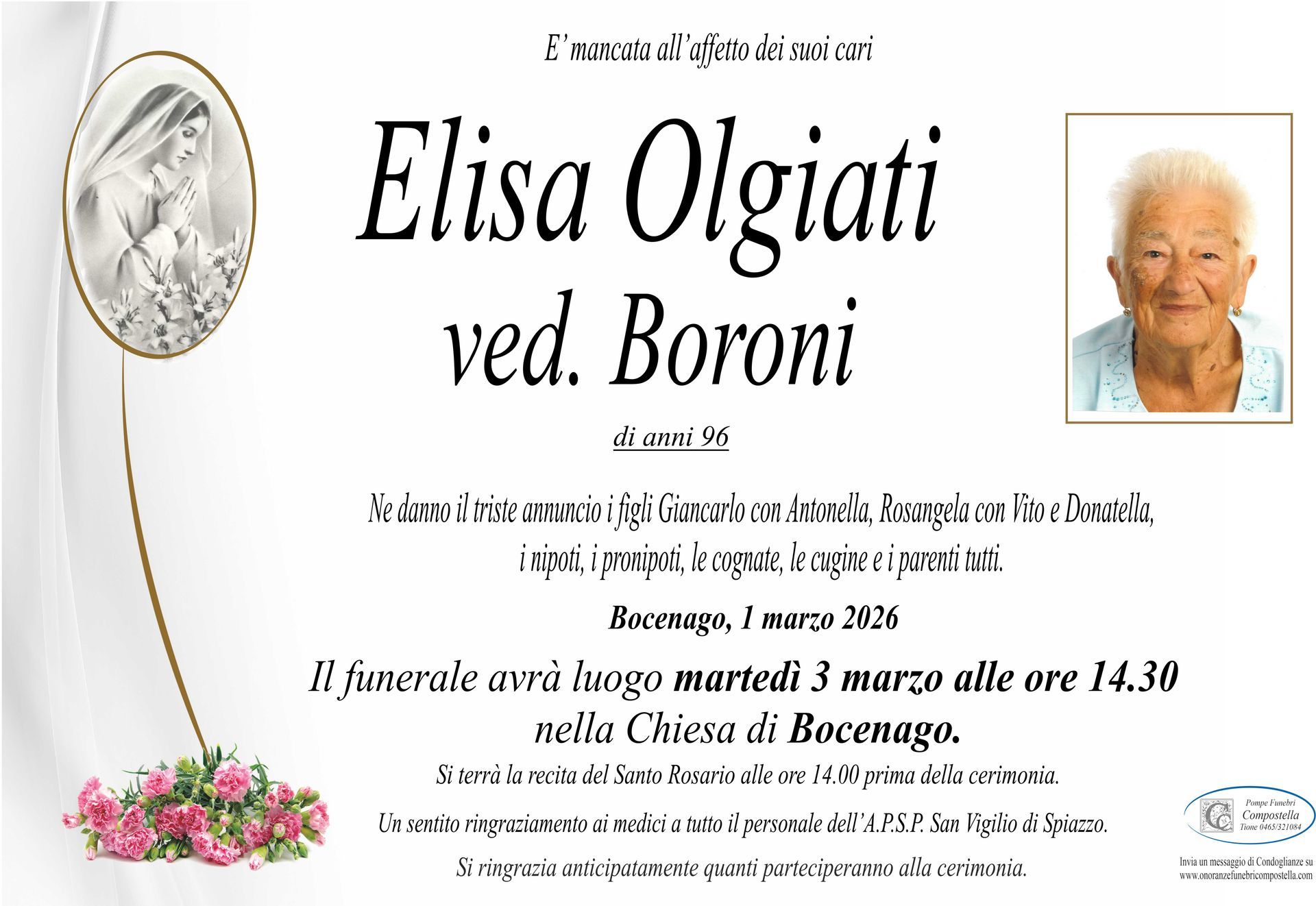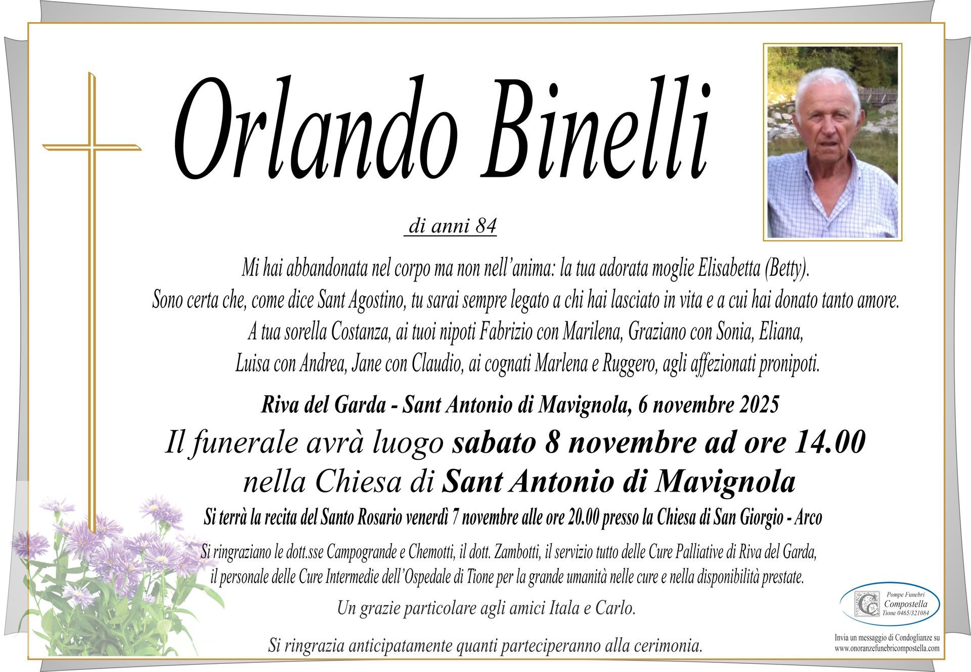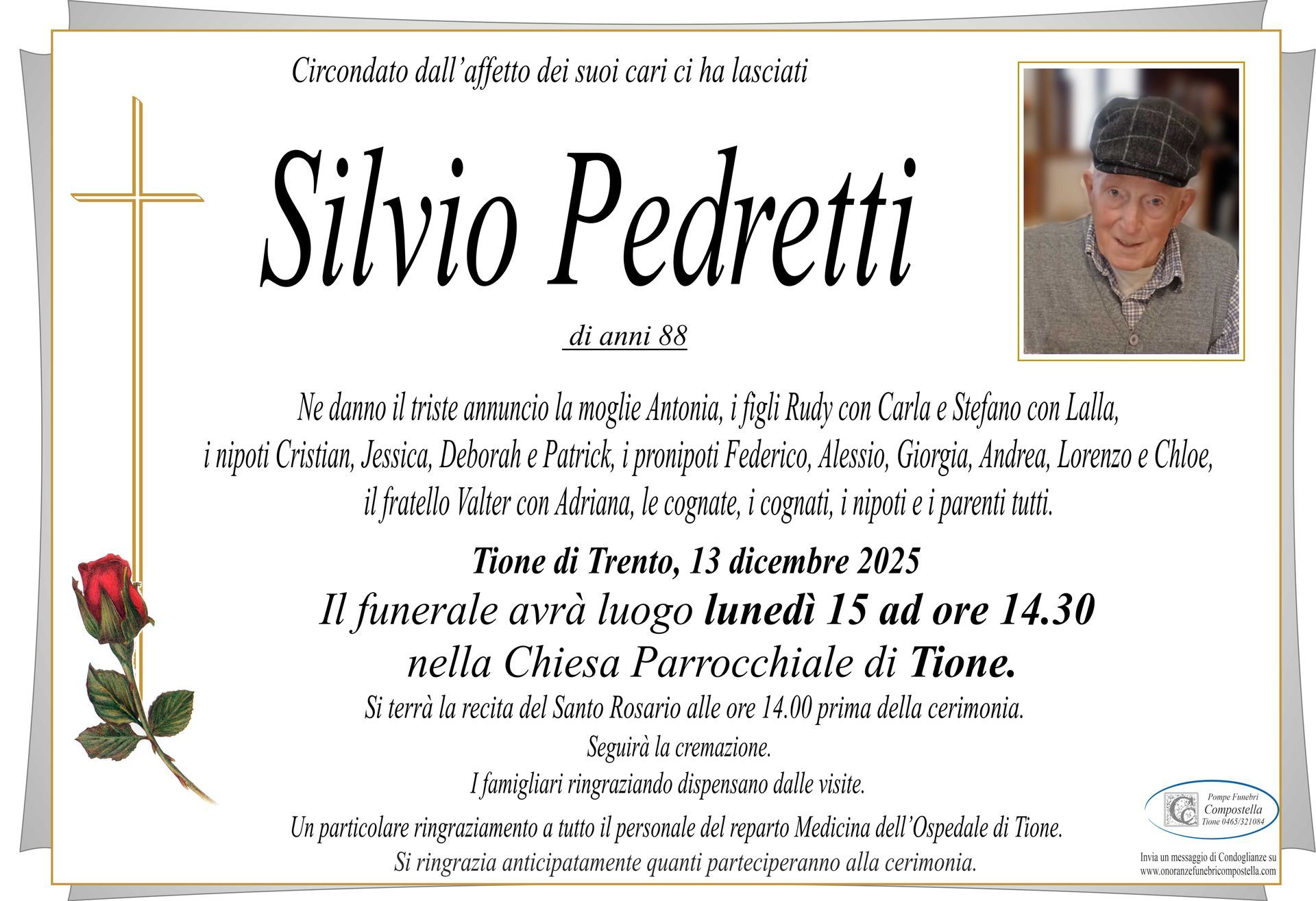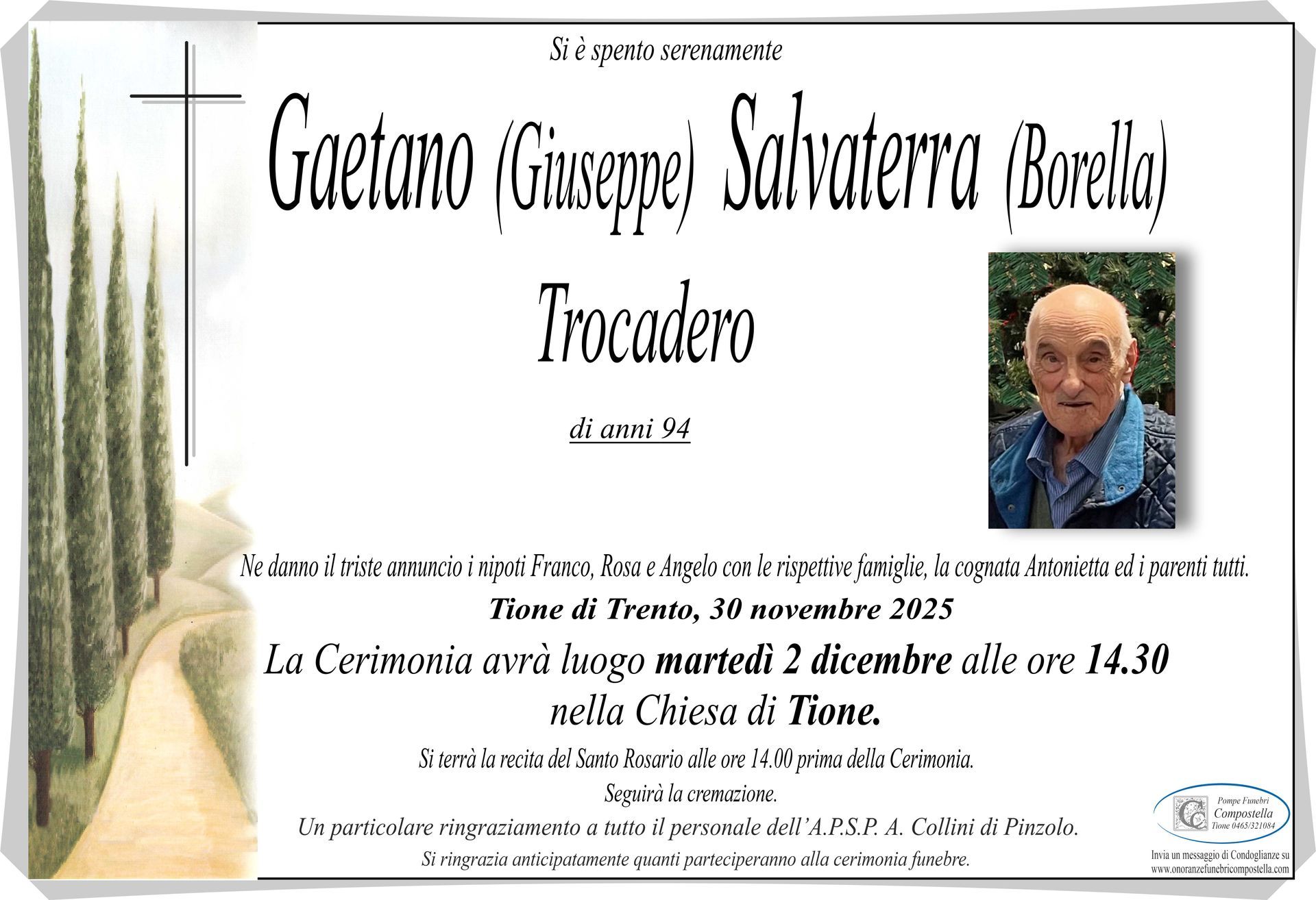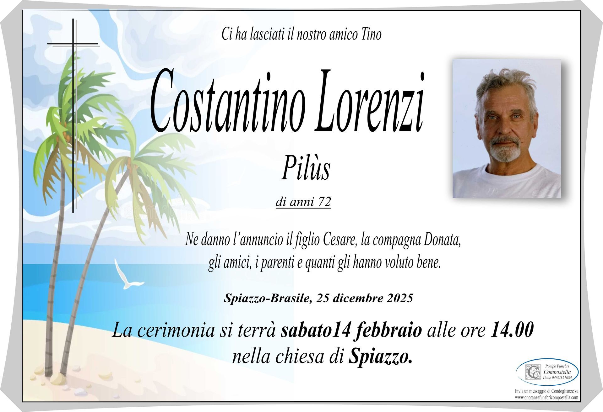 ContattiOnoranze Funebri Compostella a Tione di Trento è disponibile per la pubblicazione di manifesti funebri e condoglianze online.