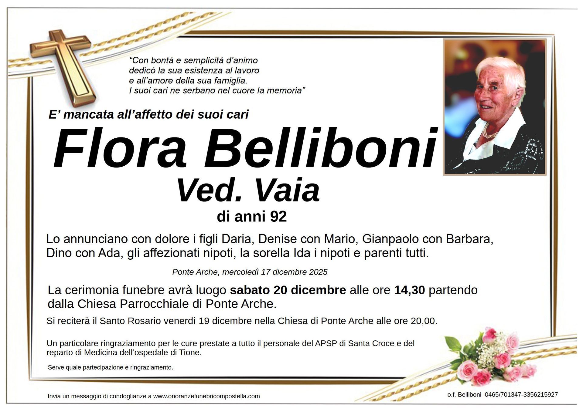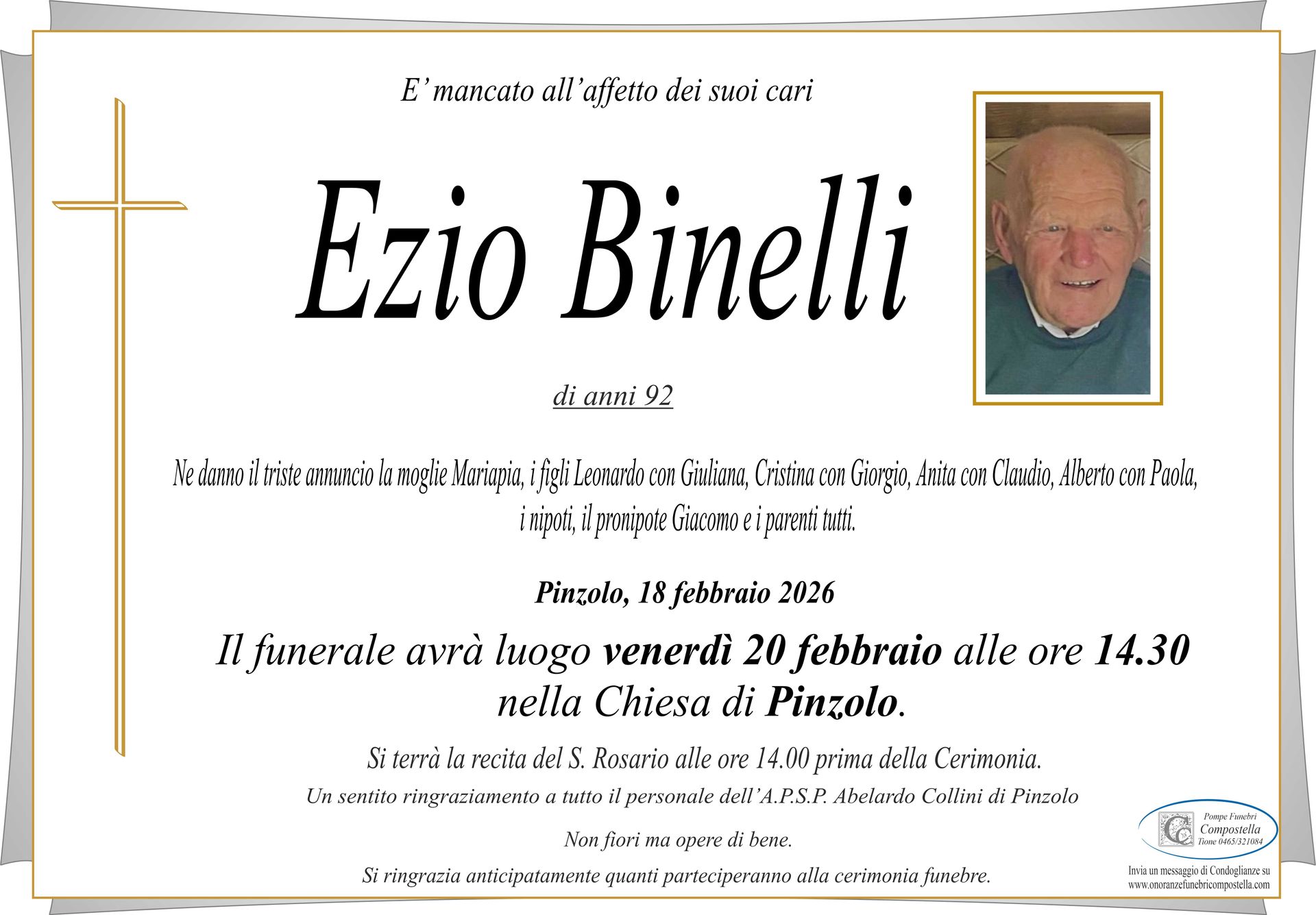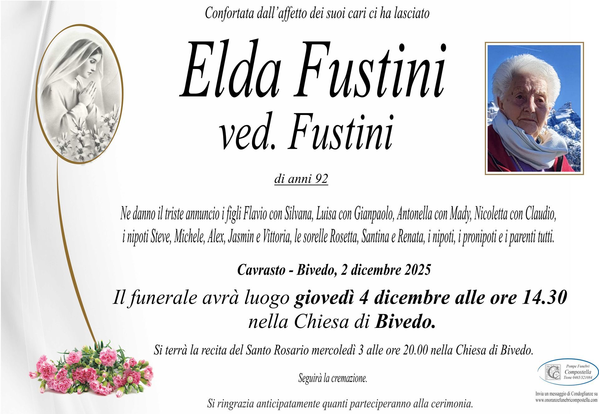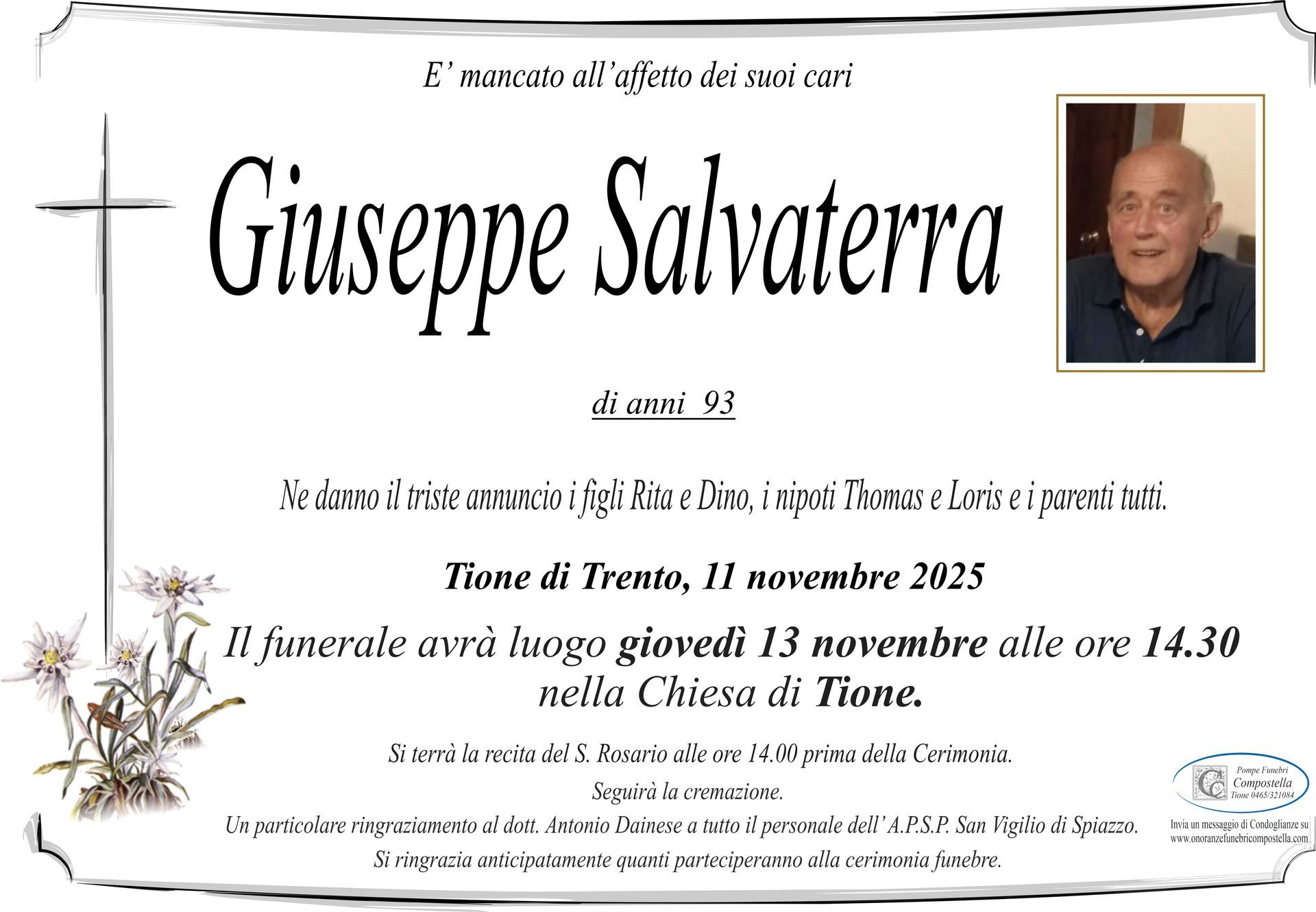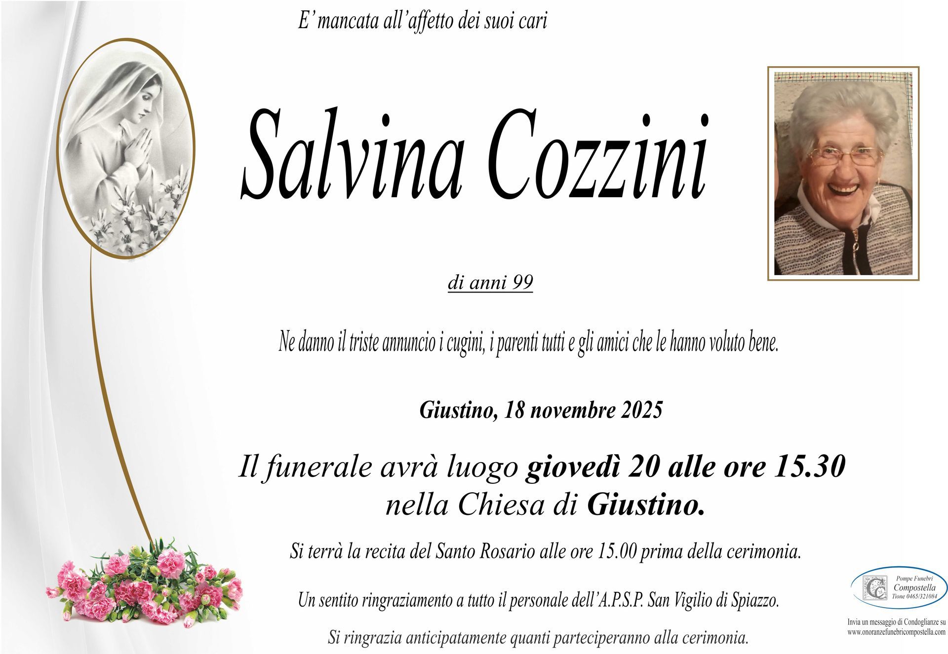 ContattiOnoranze Funebri Compostella a Tione di Trento è disponibile per la pubblicazione di manifesti funebri e condoglianze online.